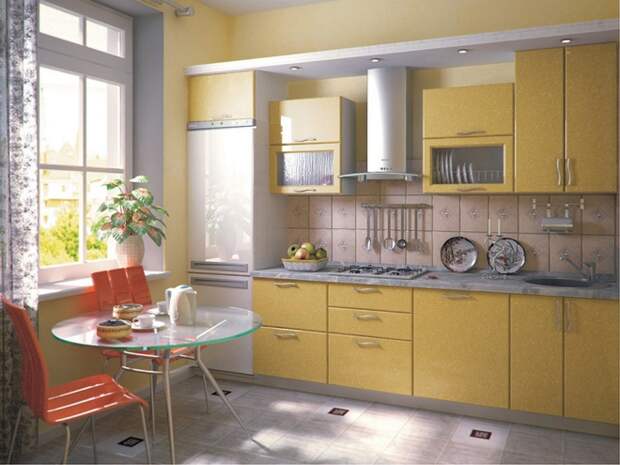 - линейная – кухонный гарнитур с рабочей поверхностью устанавливают вдоль одной стены. Это создает сложность в быту: приходится много передвигаться по одной линии. Зато у противоположной стены свободно разместятся обеденная группа и зона отдыха;