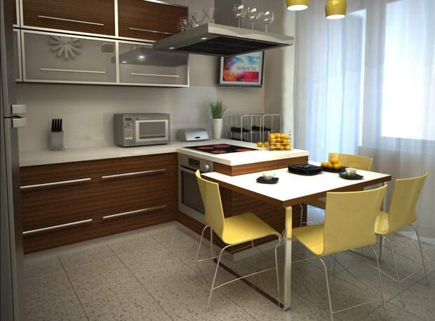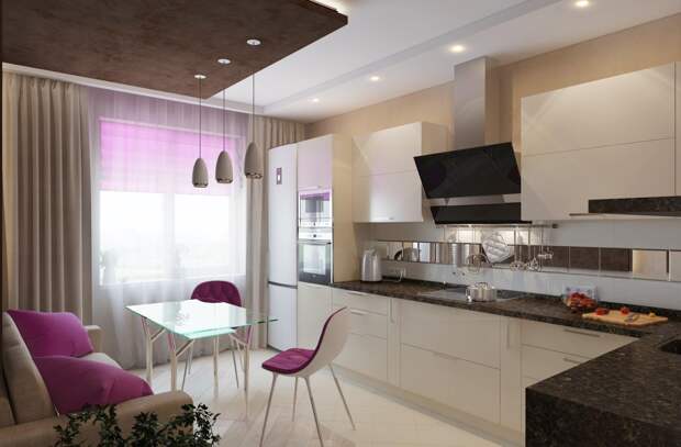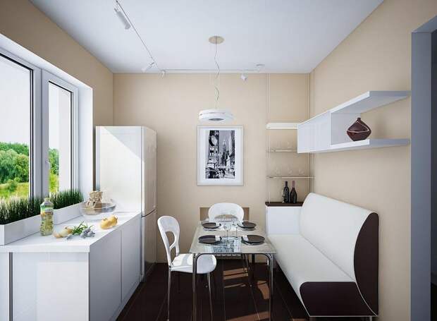 Путем такого совмещения можно реализовать массу интересных проектов:- рабочая зона кухоньки полностью переносится на балкон. На площадке устанавливают нижние шкафы, верхние элементы можно расположить только справа и слева (в торцах) лоджии. Непосредственно комнату преобразуют в столовую или гостиную (подходит для однокомнатной квартиры или компактной двушки);
