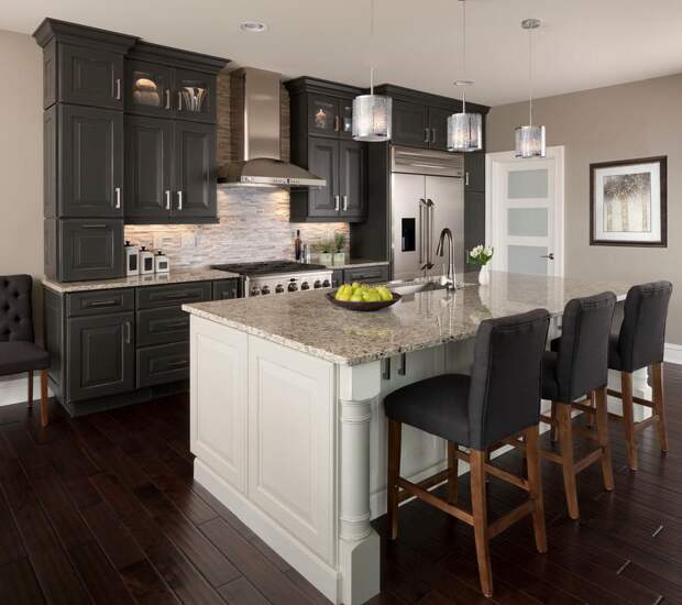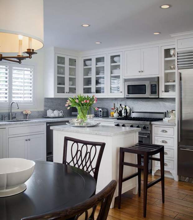 Помещение с островком отлично смотрится в просторных кухнях или квартирах-студиях. В тринадцатиметровой комнате целесообразно устанавливать многофункциональный остров (рабочая поверхность и барная стойка, варочная панель и система хранения в виде внутренних выдвижных ящиков).