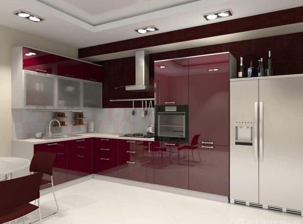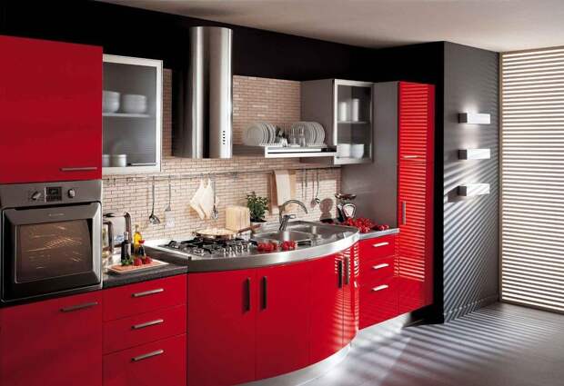 Яркий красный цвет органично смотрится на кухне, но использовать его надо дозированно (отделка штор, подушки для стульев). Смягчить насыщенность алого помогут оттенки белого, зеленого.