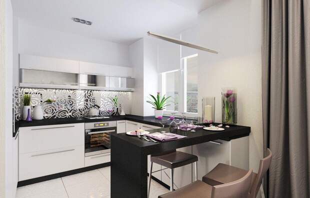 Если свободной площади для создания уютной столовой зоны не находится, лучше установить оригинальную барную стойку. Мойку монтируют у окна, встраивая чашу в широкий подоконник.