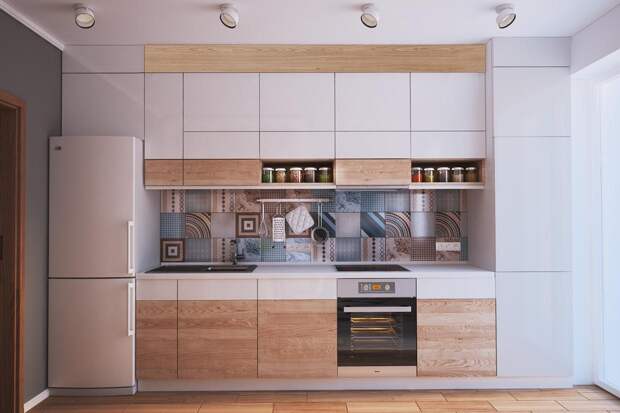 Чаще всего поверхности оклеивают однотонными обоями или штукатурят, красят. Модный тренд 2020 года – комбинирование материалов, помогающее зрительно разделить кухню на зоны. Поэтому для акцентной стены в столовой подбирают нестандартные решения: камень, кладка из декоративного кирпича, деревянная вагонка, пластиковые панели, фотообои. Рабочий фартук оформляют керамической плиткой, мозаикой, стеклянными полотнами с рисунками.