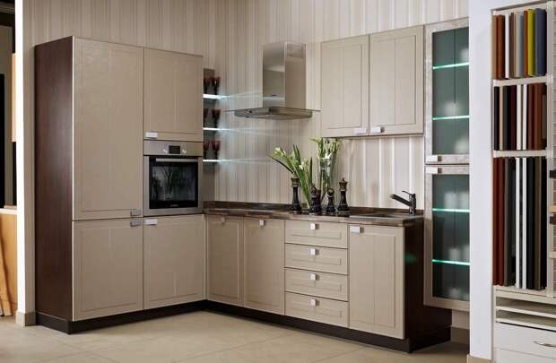 При планировке и выборе дизайна кухни 13 м2 сложной формы может быть трудно реализовать какой-то распространенный вариант расположения предметов. Прежде всего, это относится к помещениям в панельном доме, где частые перепланировки и объединения с лоджиями. Каждый случай – индивидуален, определяясь с размещением предметов, учитывают расположение окон, дверей, стен, выход на балкон. Сначала выбирают места для мойки, плиты, крупной бытовой техники.