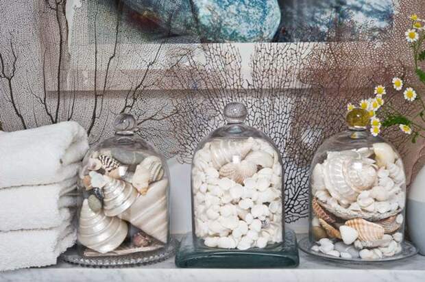 Это помещение более всего подходит для декора в морском стиле. Чаще всего ракушками декорируют рамы зеркал, аксессуары (дозаторы для жидкого мыла, стаканчики для щеток). Отличная идея – выложить природными материалами картину на стене над раковиной в ванной комнате.