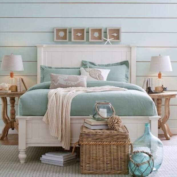 Отличным дополнением к спокойной атмосфере спальни станут пять-шесть панно с деревянными белыми состаренными рамами и несколькими ракушками, наклеенными на полотно.