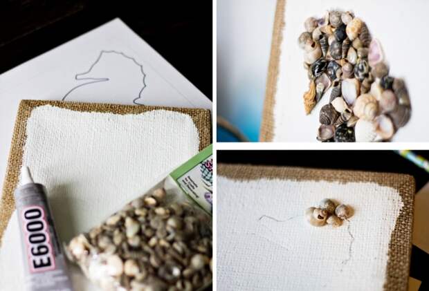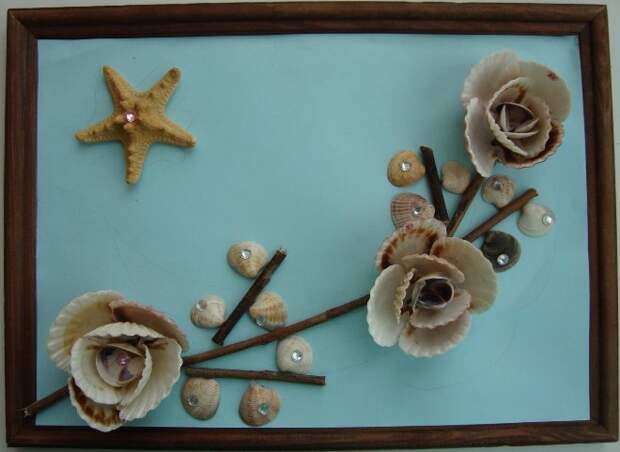 Создавая украшение, рекомендуется использовать специально подготовленную основу (картон, холст в раме, подрамник, обтянутый тканью). Темы для панно могут быть самыми различными. Ракушки наклеивают в произвольном порядке или же на холсте выкладывают фигурки русалки, морского конька.