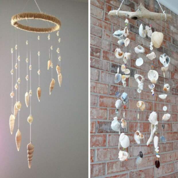 Создать «музыку морского ветра» несложно: из двух одинаковых палочек делают крестовину. На нитки подвешивают ракушки и перламутровые пластины, фиксируя элементы узелками. Набрав 8 нитей, закрепляют их на крестовине. Подбирать надо примерно одинаковые элементы, чтобы крестовина не перекашивалась.