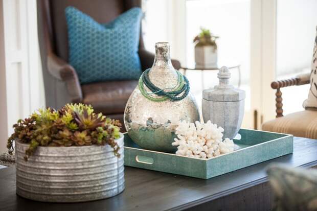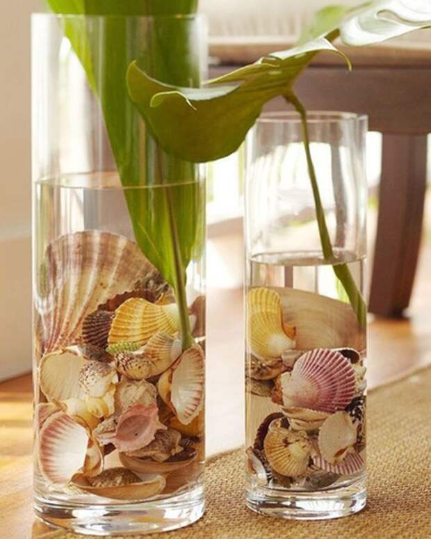 Комната, где проводят семейные праздники и встречают гостей, заслуживает оригинального и стильного декора. Если в ней есть аквариум, ракушки и камушки можно живописно разложить на дне. Крупные раковины, привезенные из разных путешествий, заслуживают мест на открытых полках. Группа массивных стеклянных ваз, заполненных песком и разноцветными раковинами, будет отлично смотреться на консоли.