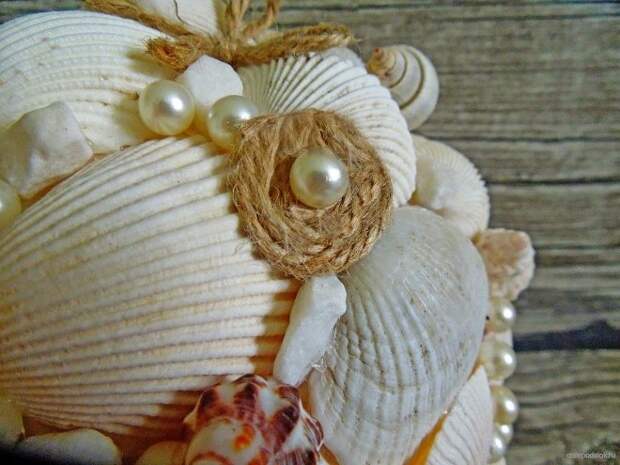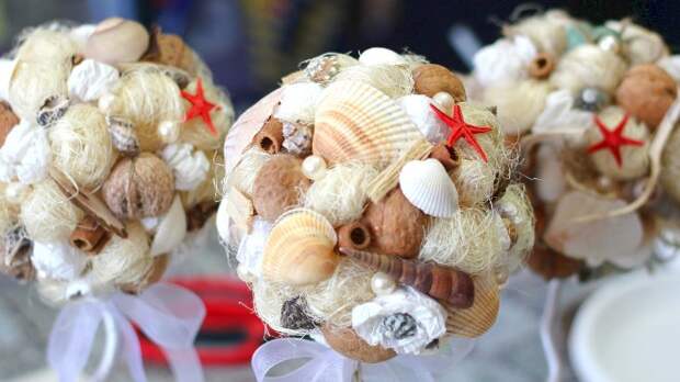 Оригинальный и нежный топиарий из ракушек создается в обычной технике. В качестве элементов, украшающих шар, используются раковины, кусочки кораллов, бусины, мелкая галька. Маленькие бантики из сизаля придадут поделке одновременно суровый морской и романтичный вид.