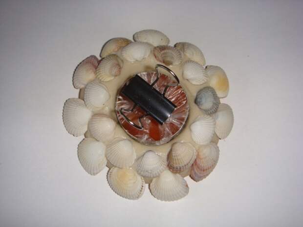 - По контуру круглого деревянного основания небольшого диаметра приклеивается ряд раковин.