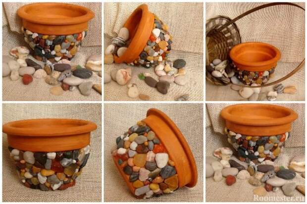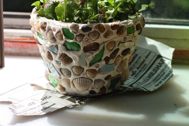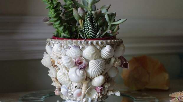 Для декорирования емкостей больших размеров лучше всего подойдут раковины моллюсков. А вот небольшие горшочки интересно преобразит широкая красивая кайма из ракушек. Чтобы горшок не смотрелся слишком пестро, рекомендуется покрасить его в белый или песочный цвет. Землю возле цветка можно закрыть небольшой серой галькой, которая будет отлично сочетаться с белой структурной поверхностью и защитит грунт от пересыхания.