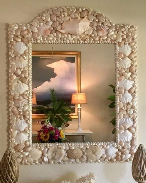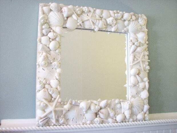 Зеркало у туалетного столика, декорированное кораллами и раковинами моллюсков, поддержит морскую тематику интерьера. Бусы или гирлянды из нанизанных раковин, морских звезд, оригинально украсят окно.