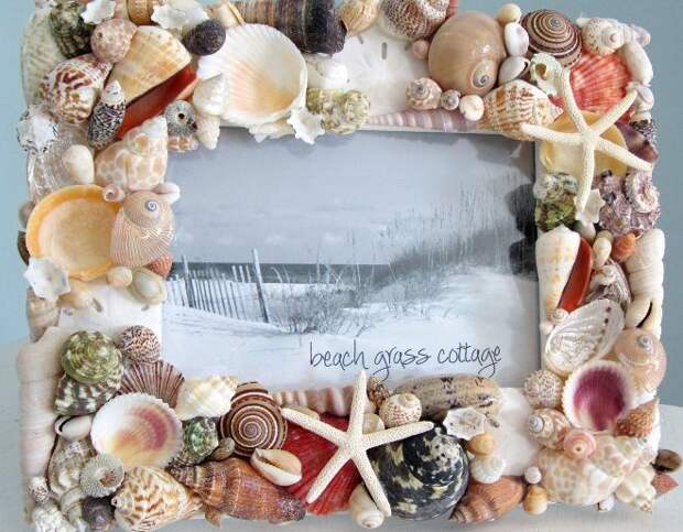 Оригинальный вариант – украшать раковинами нижнюю часть рамки, а верхнюю и боковые стороны покрасить голубой краской.Или же в верхнем углу рамы наклеить небольшую морскую звезду, несколько мелких ракушек, а остальные стороны хорошо смазать клеем и посыпать промытым песком – получится своеобразный кусочек морского берега.
