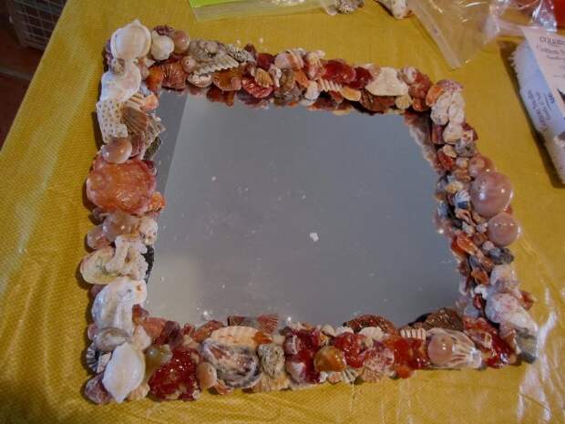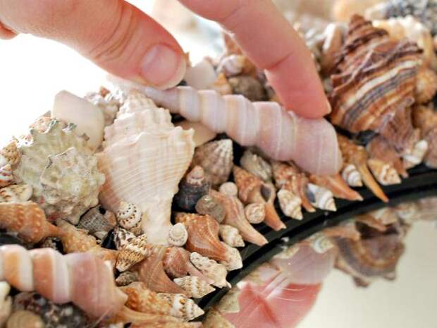 - Затем поверхность рамы заполняют маленькими ракушками.