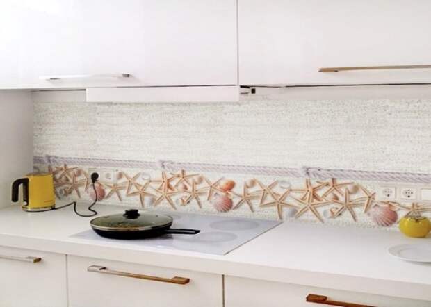 Оригинальным декором для кухни станут несколько горшков разных размеров, декорированные ракушками. Чтобы поддержать морскую тематику в комнате, можно декорировать раковинами фартук. Не следует полностью выкладывать фактурными элементами рабочую поверхность – ее будет сложно мыть. Достаточно оформить ракушками отдельные участки или выложить ими бордюр фартука.