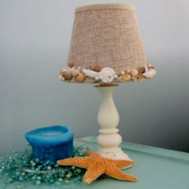 При декорировании предметов освещения надо определиться заранее, на какую часть лампы будут крепиться раковины. Если украшается основание светильника, то желательно выбрать несколько крупных и много мелких ракушек. Приклеивать их можно хаотично или по определенной схеме (эскиз надо рисовать заранее). Морская звезда, кусочки кораллов отлично подойдут для украшения абажура или плафона. Крупные элементы лучше приклеить по краю, а мелкие распределить выше.
