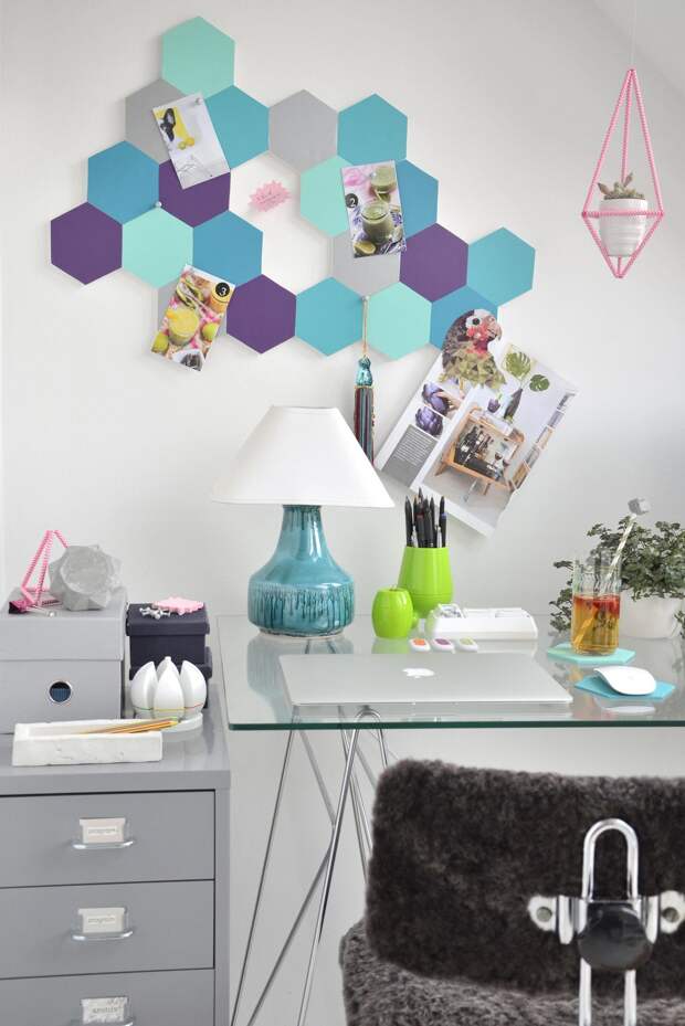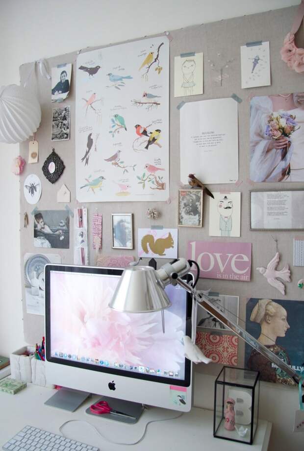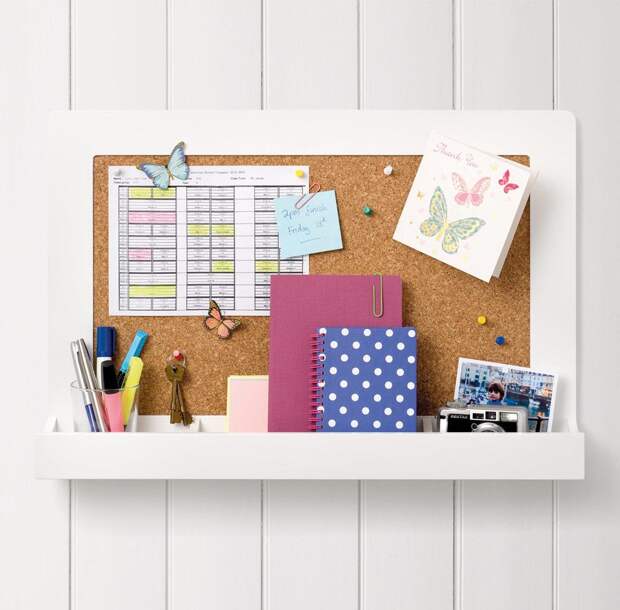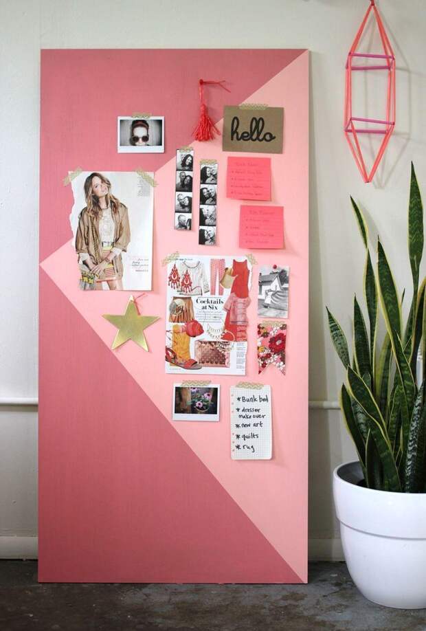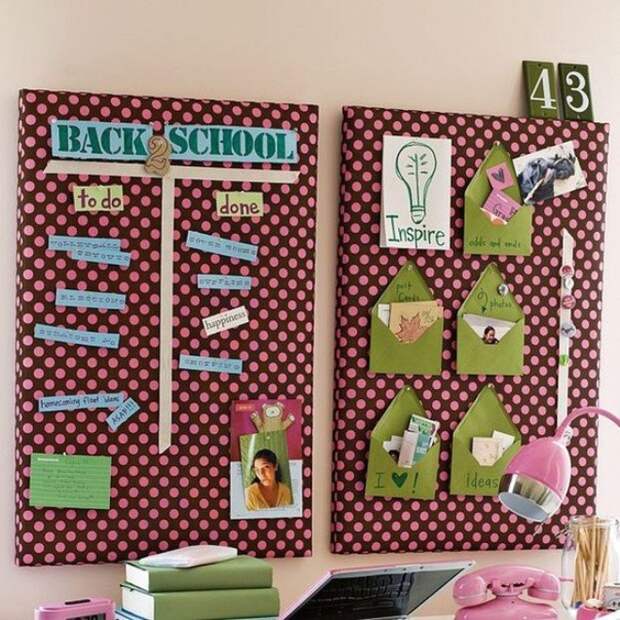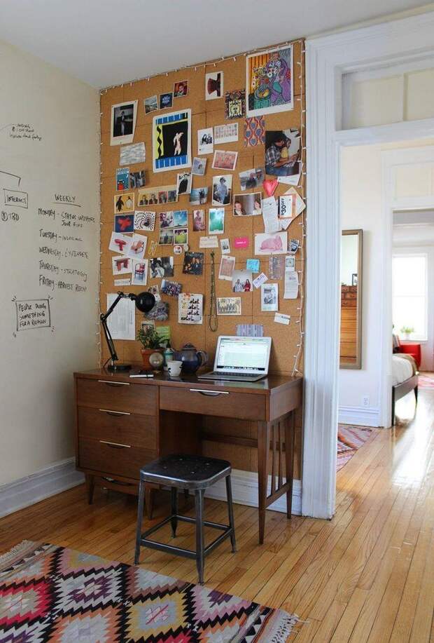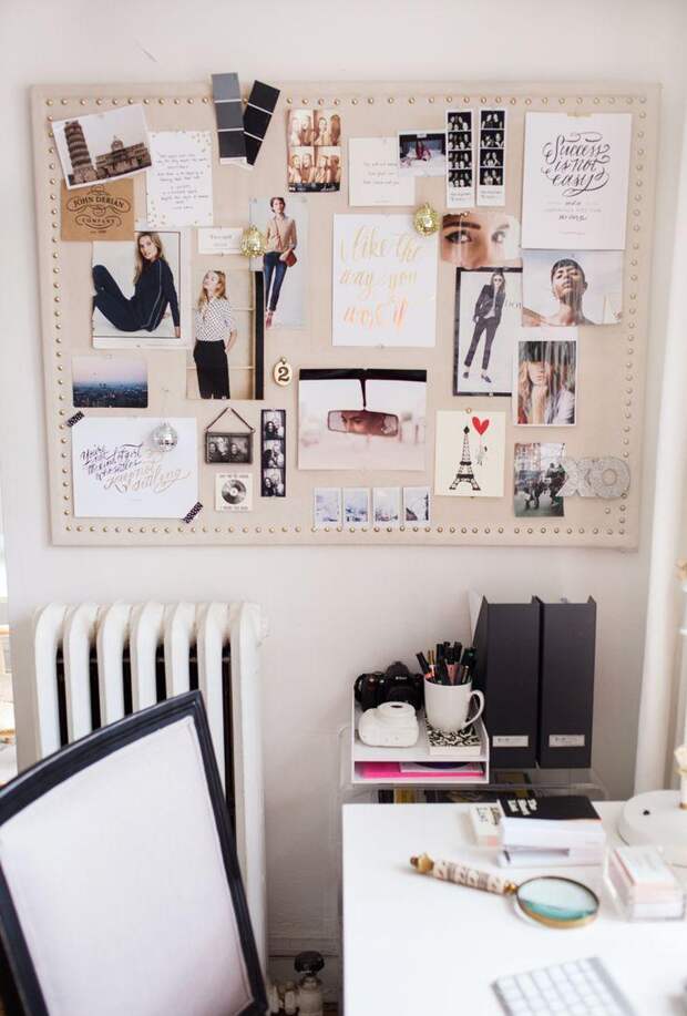 Доску для заметок можно оформить по-разному, в зависимости от вкуса владельца комнаты. Это не только интересный вариант декорирования помещения, но и удобный способ для хранения записок, фотографий и рисунков. Она будет напоминать владельцу о планах на день и поможет организовать не только пространство, но и время.