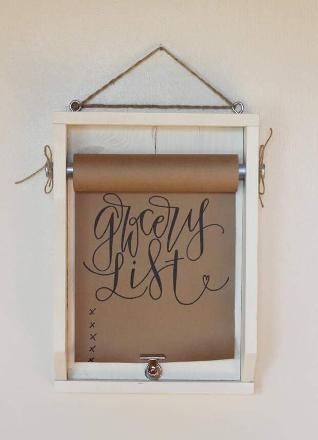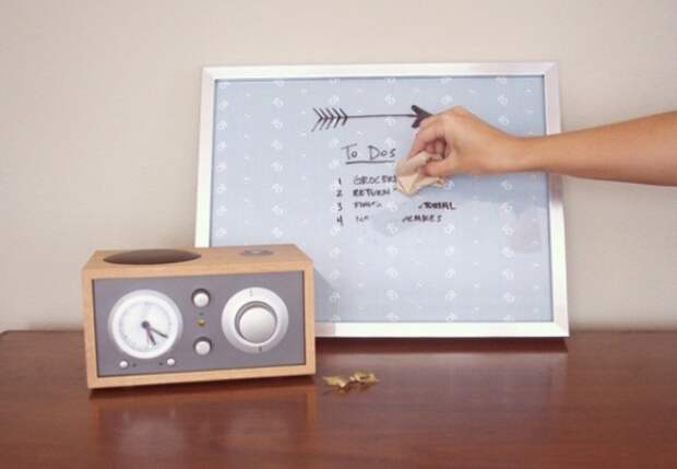 Так как маркер можно стереть без особого труда с гладкой поверхности, для изготовления лучше всего подойдет стеклянное покрытие. Например, рамка для фотографии формата А3. Если вы планируете украсить его на свой вкус, выбирайте изделие, обрамленное рамой нейтрального цвета. Чтобы сделать доску для записей, нужно вынуть стекло и покрасить его с внутренней стороны белой или другой краской светлого цвета (чтобы было видно темные маркерные надписи). После того, как состав высохнет, рамку можно собрать обратно. Если не хочется сильно возиться с краской, можно просто вставить вместо слоя белый лист бумаги. Готовую доску можно разместить в прихожей над пуфом, чтобы оставлять напоминания о вечерних делах или просто писать приятные слова близким. Можно взять маленькую фоторамку и сделать из нее настольную мини-доску.