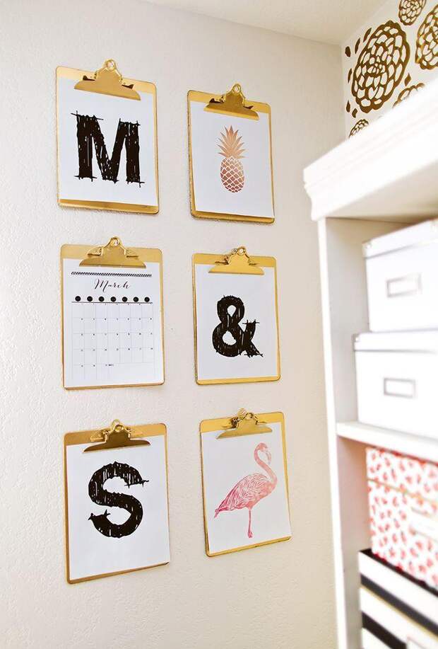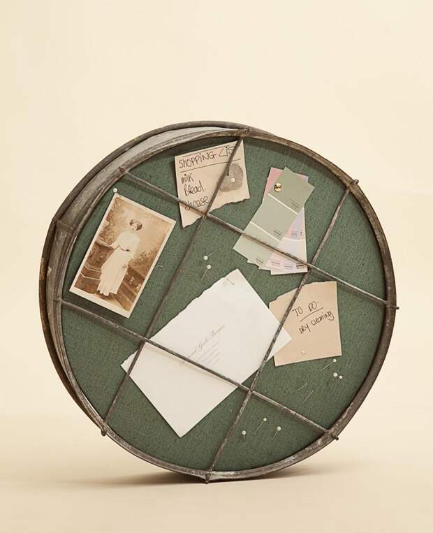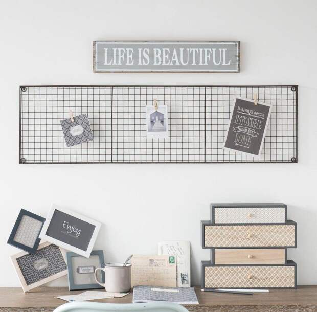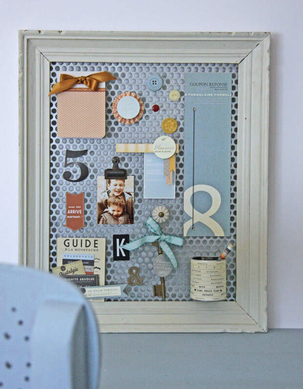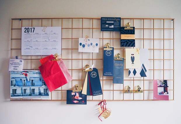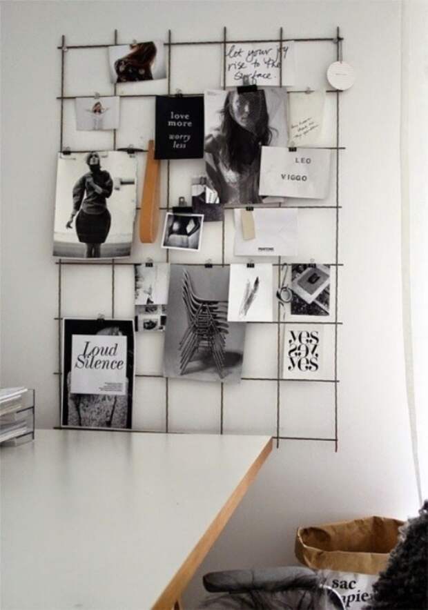 Чтобы сделать место для записей из сетки, достаточно взять металлическое полотно любого размера. Бумажки и фото крепятся к нему на канцелярские зажимы или магниты.