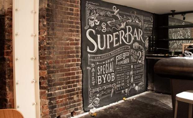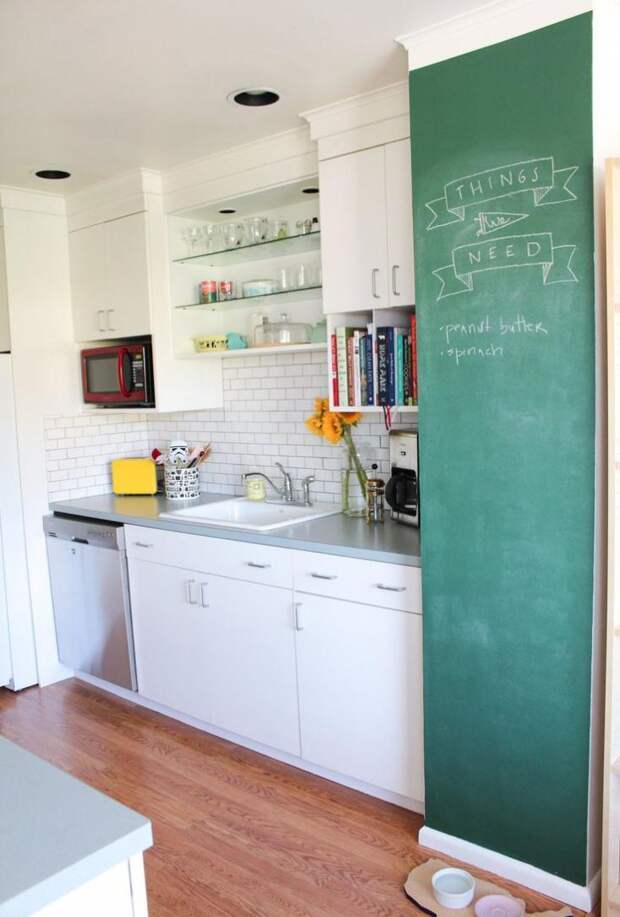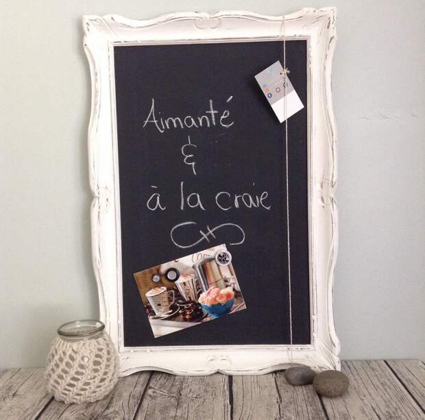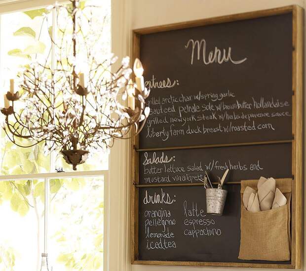 Это полотно черного цвета, на котором можно рисовать и писать мелками. Если оформить его в рамку нежного оттенка (можно оклеить старыми обоями) и сделать украшения в виде мелких цветов, такая доска впишется в стиль прованс. А вот «голая» черная доска или обрамленная деревом прекрасно впишется в лофт. Этот вариант часто используют современные заведения, оформленные в индустриальном стиле.