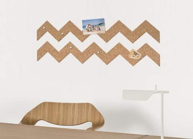 Самый бюджетный вариант, представляет собой прямоугольное полотно коричневого цвета. Такая доска изготавливается из коры пробкового дуба. Она может быть разного размера и формы, но чаще прямоугольная. На панель можно легко с помощью кнопок закреплять различные записки, бумажки, фотографии, рисунки. Она может служить и местом для коллажа, и динамичным органайзером.