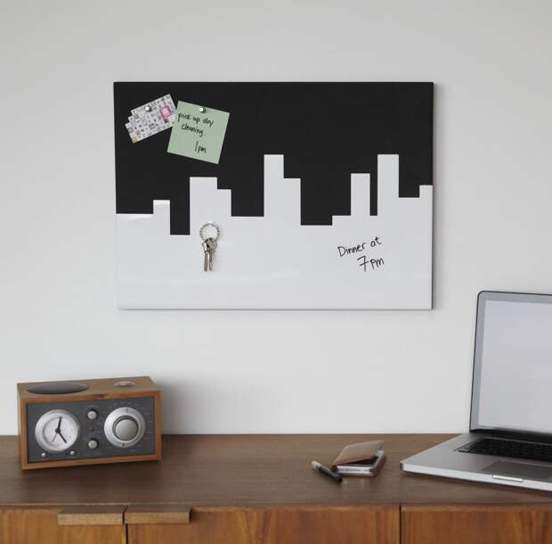 Отличается от предыдущего вида тем, что на нее нельзя приколоть записки или бумажки. В этом есть плюс: иголки не будут теряться, но есть и минус – сама доска, как и магниты, обойдутся дороже (если сравнивать с аналогичными по размеру изделиями из пробки). Обычно ее вешают на стену в комнате, размещают на ней календарь со списком дел по дням, таблицы и другие важные вещи.