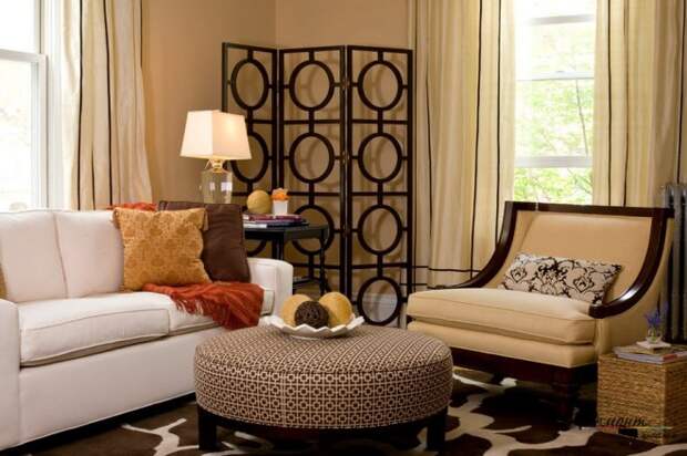 Оформление комнаты в стиле этно – это выбор определенной народности и обустройство помещения согласно их традициям и обычаям. Этническая ширма дополняется соответствующей мебелью. В таком стиле можно сделать интерьер гостиной: