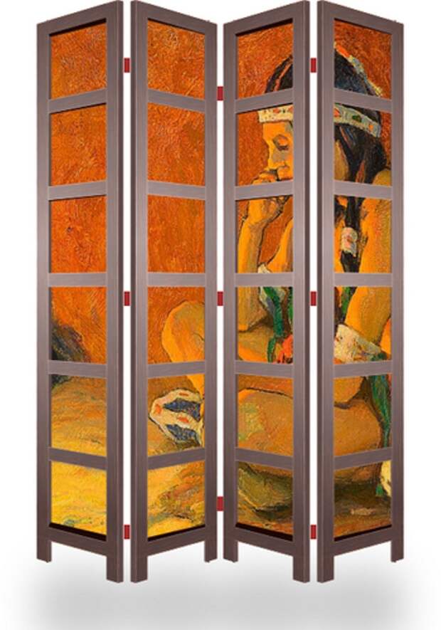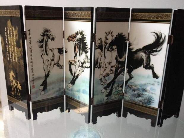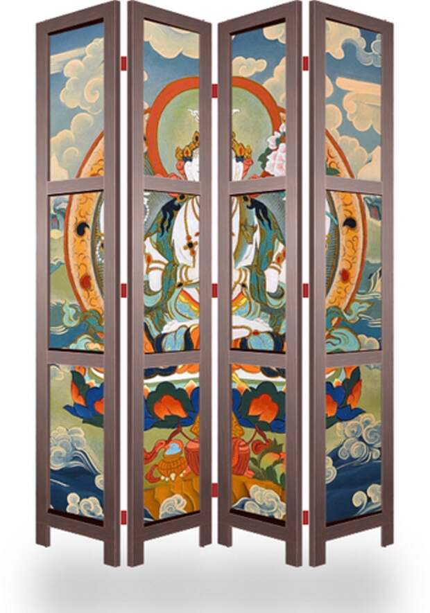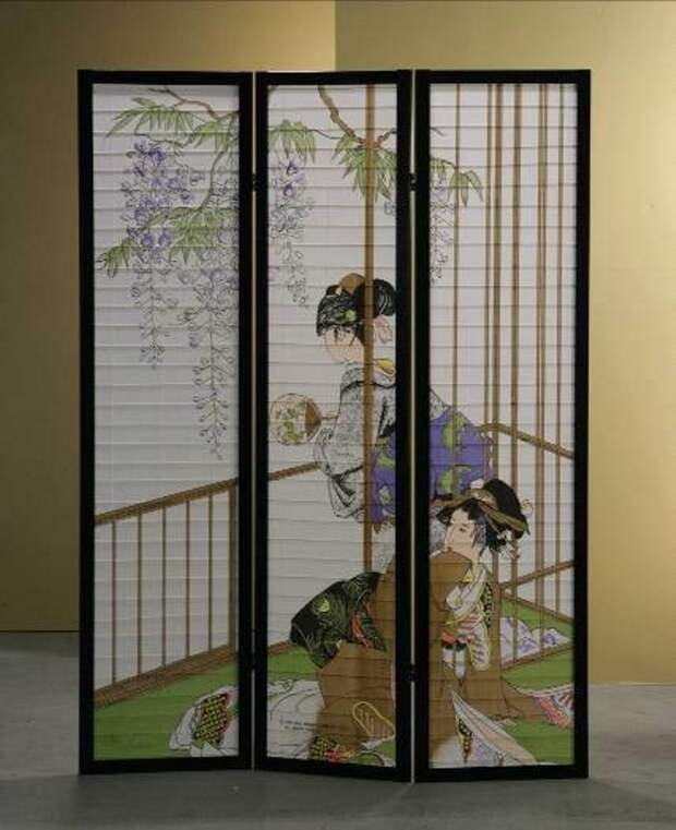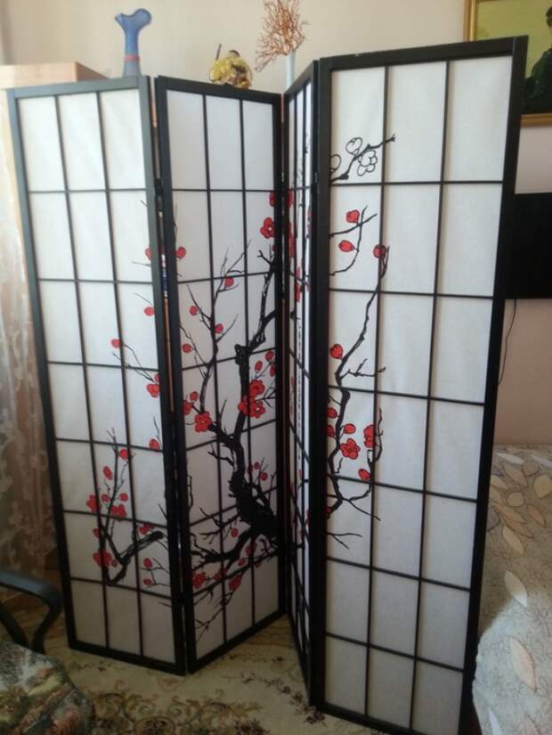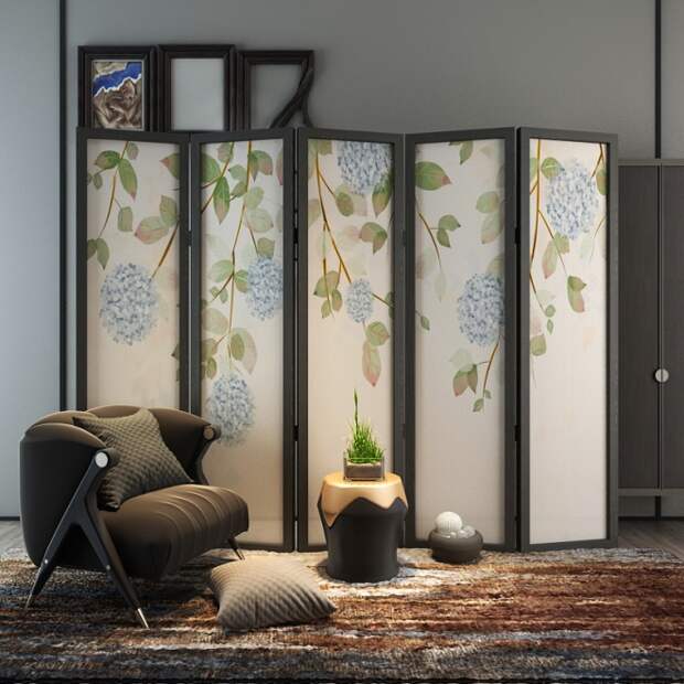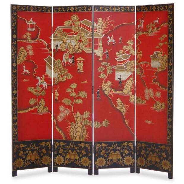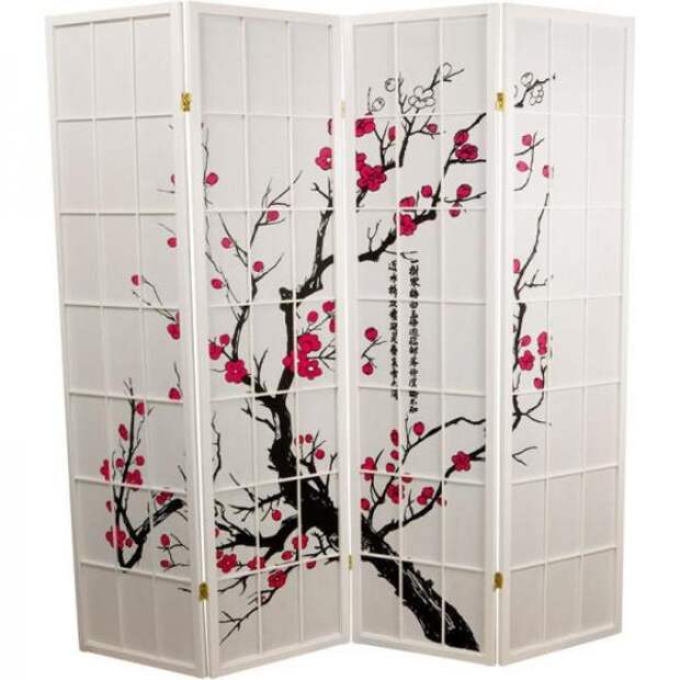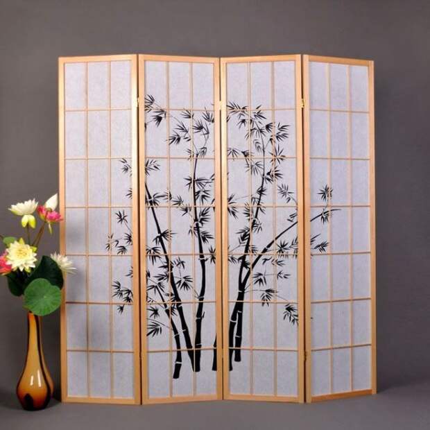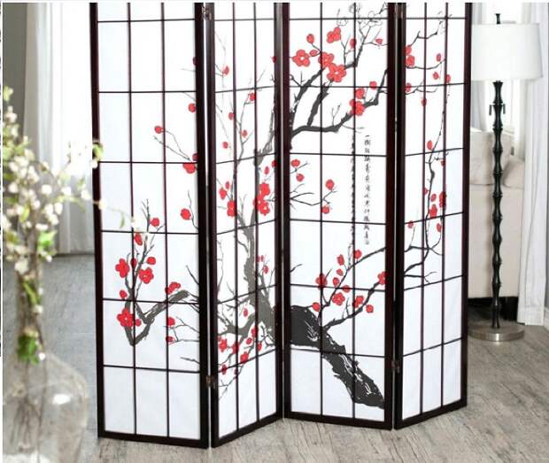 Такое необычное название характеризует интерьер с элементами китайского стиля. Подобрать ширму, выполненную по мотиву указанной народности, несложно. Обычно модели выполняются из тонкого дерева, а полотно состоит из рисовой бумаги. На поверхности изделия изображают традиционные китайские мотивы: