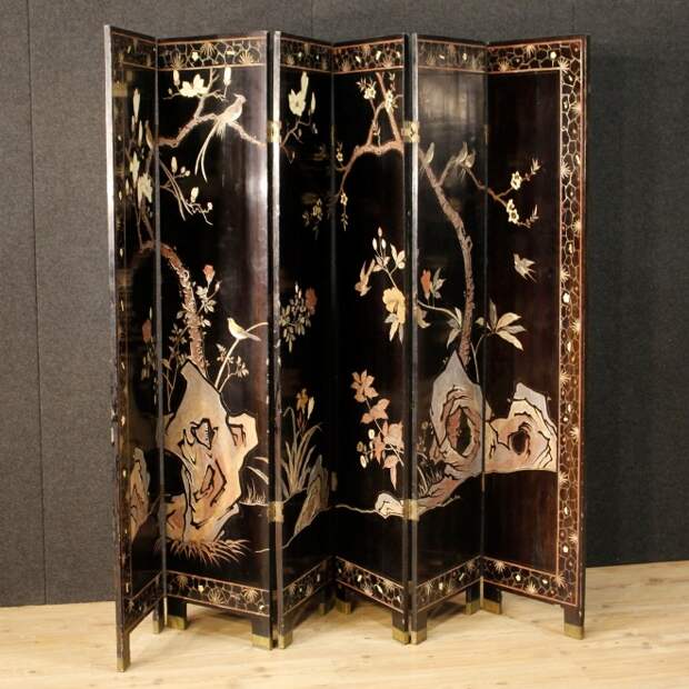 Палитра шинуазри разнообразна. Можно встретить ширмы светло-бежевого оттенка и ярко-бордового цвета. Черно-золотые ширмы позволят разделить пространство на несколько функциональных участков.