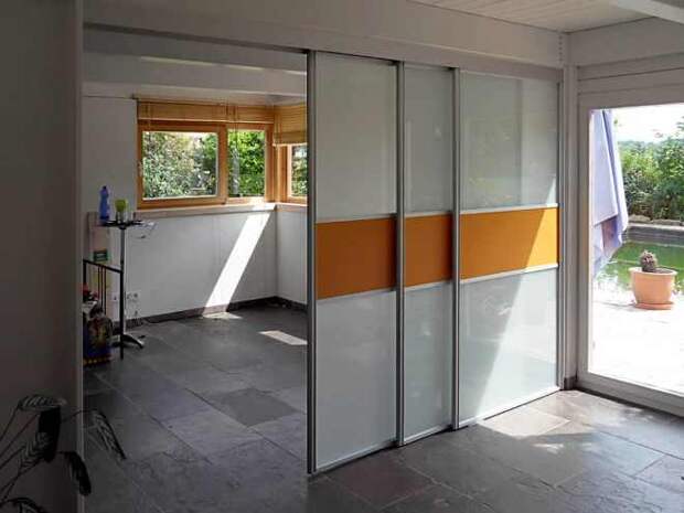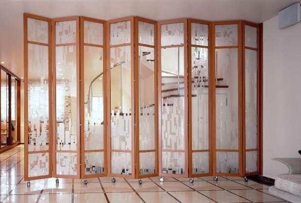 Использование ширм из стекла отмечается в офисных зданиях или домашних кабинетах. Такие конструкции позволяют повысить освещенность помещения, в отделенной зоне нет необходимости устанавливать дополнительный свет. Стекло обеспечивает хороший уровень шумоизоляции – это еще один плюс материала. Большинство моделей изготавливают из закаленного стекла.