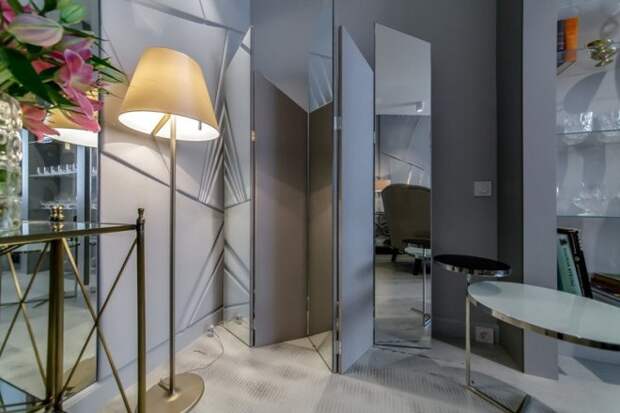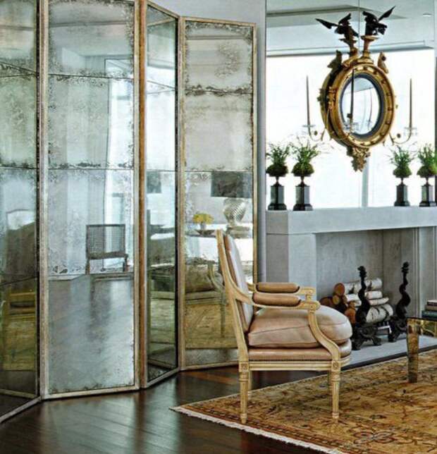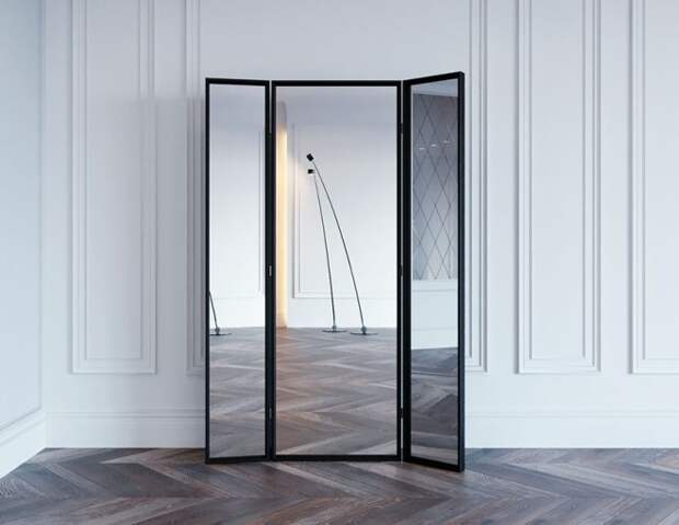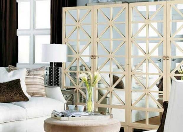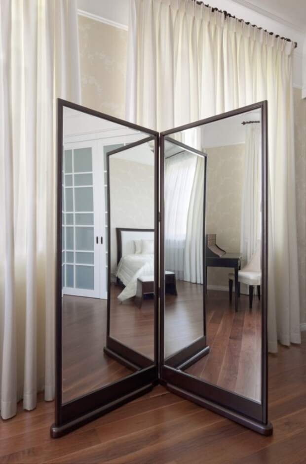 Зеркальные ширмы – отдельный вид искусства. При делении помещения на секторы создается впечатление, будто комната сильно расширилась. У такого изделия есть неоспоримое достоинство – его можно использовать по прямому назначению. Например, ширмой из зеркала можно разделить квартиру-студию на комнату и прихожую, и при этом зеркальную часть применять для примерки одежды или нанесения макияжа.