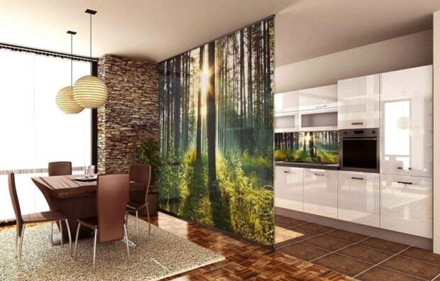 В кухне ширма послужит материалом для разделения на зону приема и приготовления пищи. Сочные и яркие расцветки будут пробуждать аппетит, а фотообои на стекле внесут оригинальности в интерьер. Ширма из ротанга тоже подойдет, но только в том случае, если она используется в интерьере кантри или прованс.
