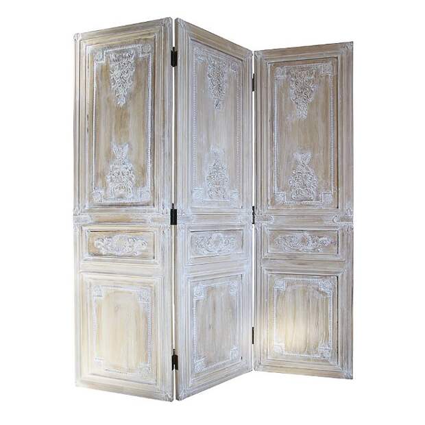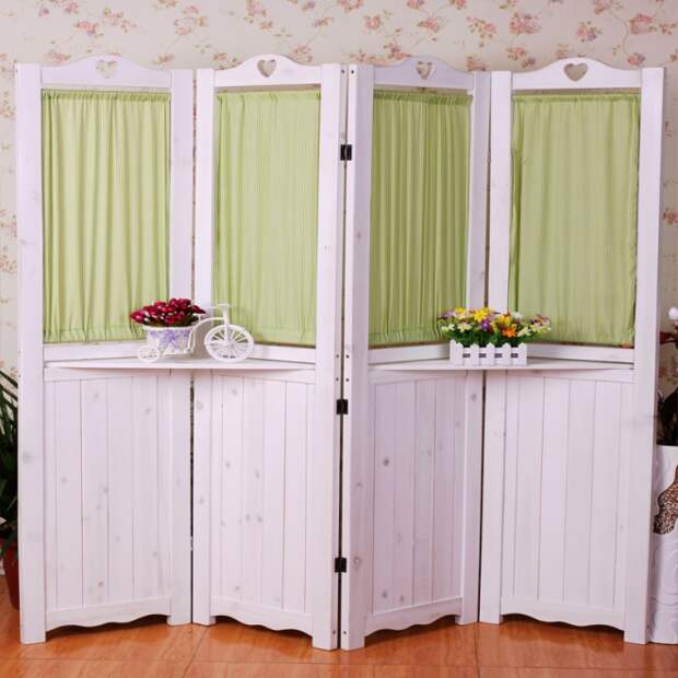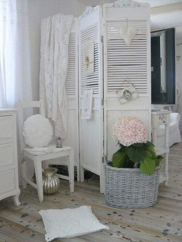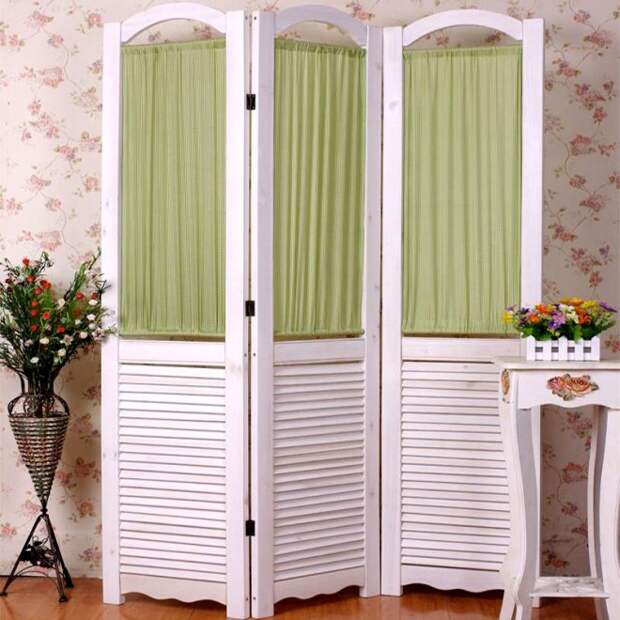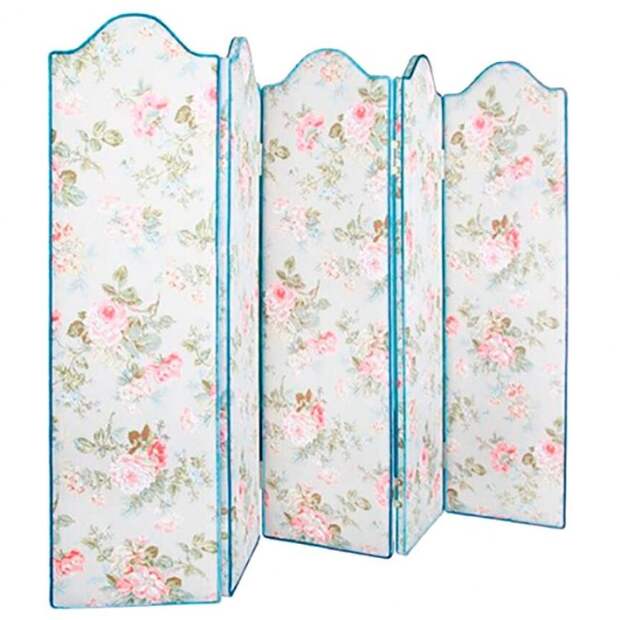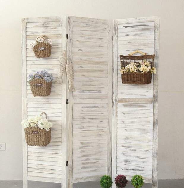 Перегородки для комнаты в стиле шебби-шик – это намеренная имитация старения материалов. Если используется дерево, то производитель обрабатывает его наждачной бумагой, создавая потертости, после чего покрывает лаком. Подобный дизайн используется и для текстиля: для ширмы изготовители берут простые ткани с незамысловатым рисунком:
