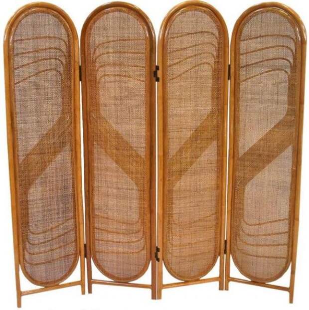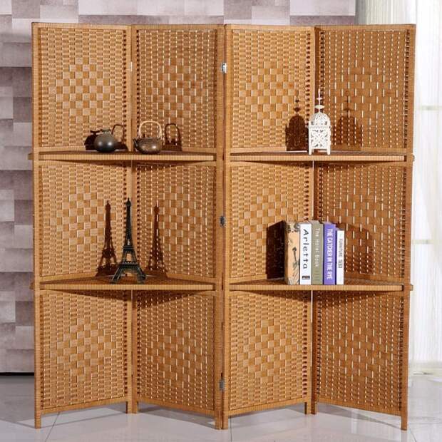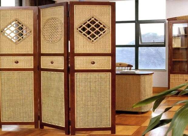 Изделия из соломы и бамбука подходят для интерьера в стиле кантри и других деревенских дизайнов. Данный материал позволяет производителям изготавливать гибкие модели – пользователь может сам менять расположение ширмы в нужном ему направлении, допуская плавные изгибы.