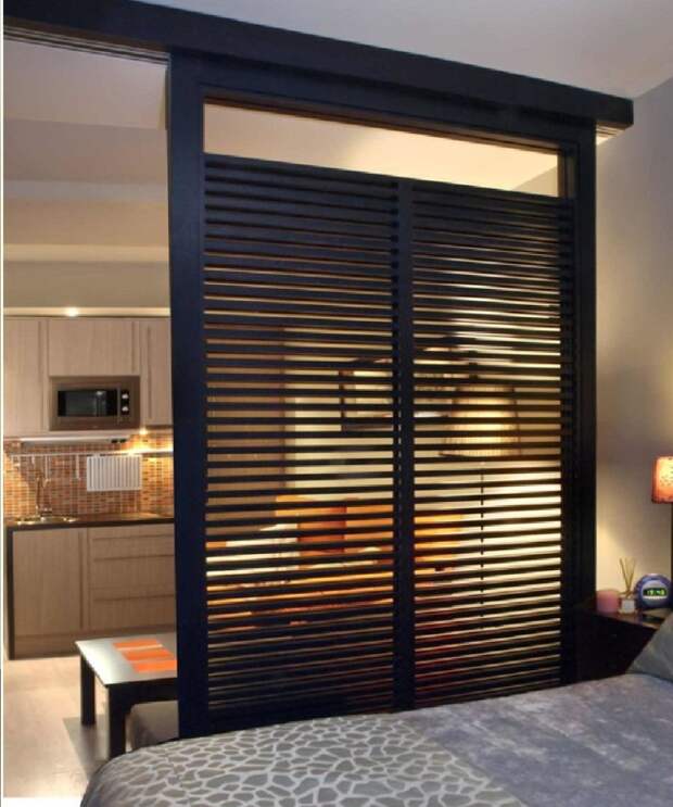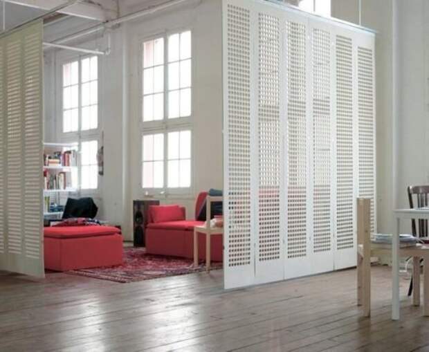 Зонировать помещение можно с помощью мобильной перегородки на колесиках. Отличие передвижной модели в ее небольших габаритах. Сложить и убрать ширму сможет любой человек, а использовать ее можно в таких целях: