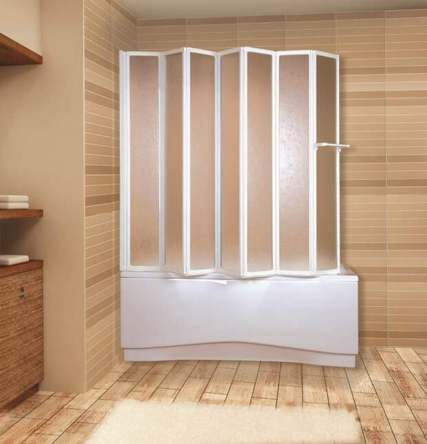 Модели для ванной комнаты изготавливаются из оргстекла – они прочные, надежные и не позволяют каплям воды расплескаться по полу. Зачастую перегородки отделяют душевую или саму ванну от основного помещения. Использование ширмы в ванной становится выгодным: она не только выполняет практическую функцию, но и добавляет изюминку в оформление.