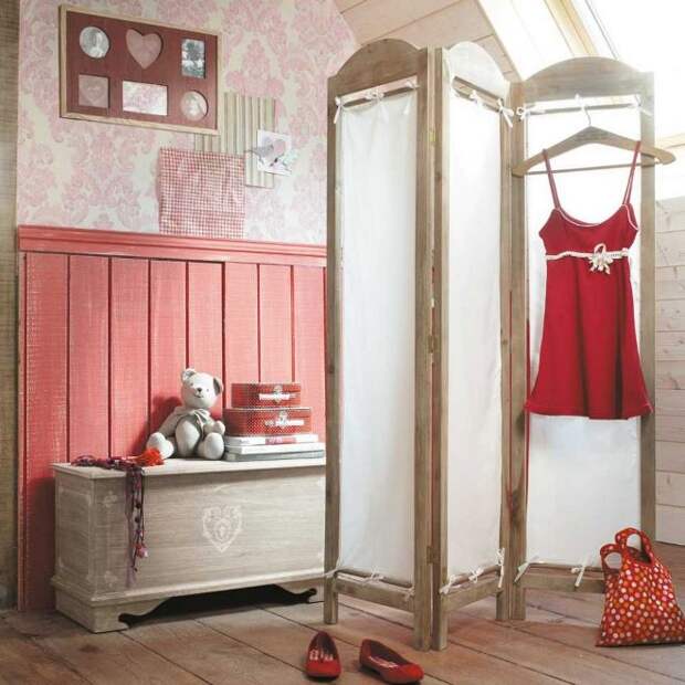 Ширма в таком интерьере выполняет декоративную роль, хотя за нее можно спрятать личные вещи или перегородить проход в кладовую.