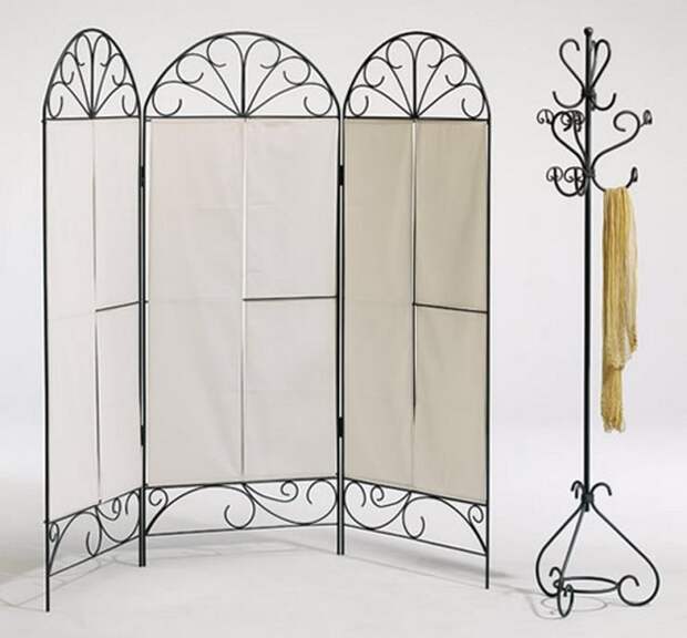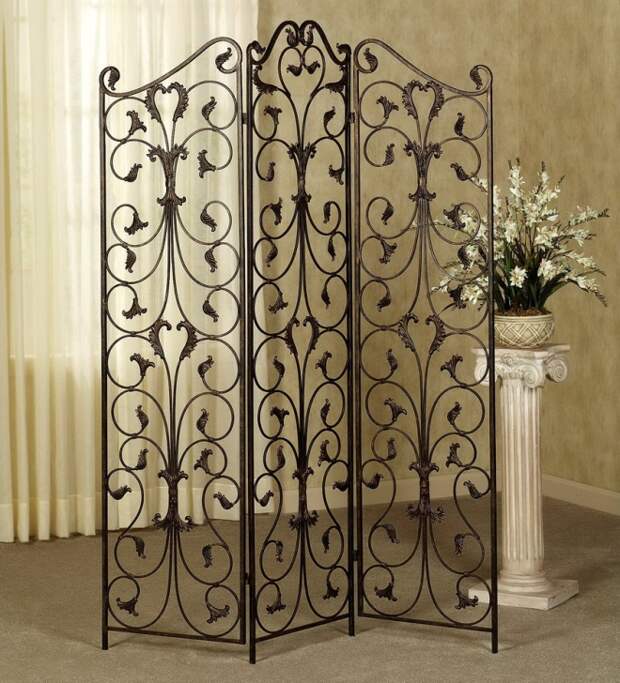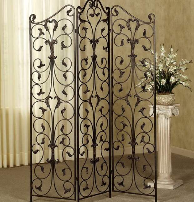 Изделия из металла больше выполняют декоративную функцию, чем практическую. Металлические ширмы зачастую прозрачные, они могут быть коваными или сварными. Ажурные кованые элементы намекают на использование конструкции в романтических интерьерах, а строгие геометрические фигуры на створках позволят применить ширму в стиле хай-тек.