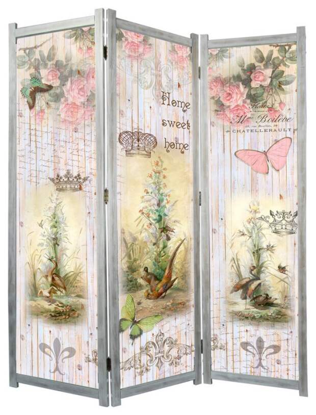 Этот стиль считается разновидностью кантри, переведенного на французский манер. На фото видно, что ширмы в таком стиле имеют неповторимый шарм, уют и романтику. Модели изготавливаются из дерева, комплектуются зеркалами, но наиболее часто можно встретить деревянные ширмы с рисунком или фотопечатью на поверхности.