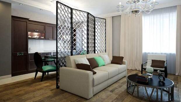 Хорошей идеей для гостиной станет ее разделение на зону приема гостей и столовую с помощью ширмы. Вариант подходит для квартир-студий, небольших по размеру. Тут можно экспериментировать: ставить прозрачную деревянную конструкцию в сетку, выбирать зеркальные или стеклянные модели.