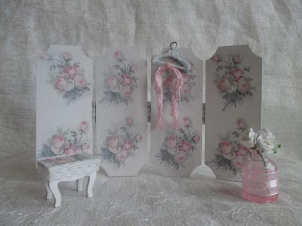 В качестве изображений используются рисунки лаванды, распустившиеся бутоны белых роз, антикварные фотографии. Ширмы из МДФ не имеют рисунка, они выполняются из тонких реек дерева, в верхней части производитель может оставить несколько смотровых окошек в виде сердец или других фигур.