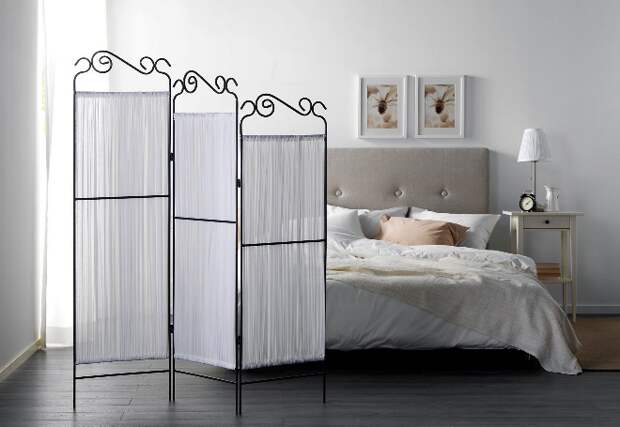 Последний вариант подходит для однокомнатных квартир: когда приходят гости не хочется принимать их там, где человек отдыхает. Для этого выделяется отдельное пространство, устанавливается напольная ширма, за которой располагается кровать. В таком случае лучше не выбирать прозрачные изделия, а отдать предпочтение стильным и соответствующим интерьеру не просвечивающим моделям.