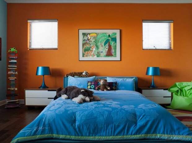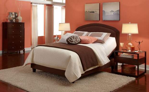 Особого внимания требует коричневый цвет. Приятный шоколадный оттенок идеален для большой светлой комнаты. Маленькую же он затемнит и уменьшит еще сильнее. Такой цвет очень красиво сочетается с синим и оттенком бирюзы, усиливая его глубину. А вот с красным получится слишком яркий акцент.