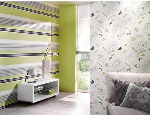 Теплый зеленый цвет приятен глазу, действует успокаивающе на нервную систему, способствует хорошему отдыху и крепкому сну. Зеленые обои могут иметь геометрический, флористический узор. В рамках одного цветового сектора обои зеленого цвета смело можно сочетать в любых комбинациях. Например, горизонтально: полосатый или однотонный низ и цветочный верх на 1-2 тона светлее. Вертикально отлично будут смотреться любые комбинации.