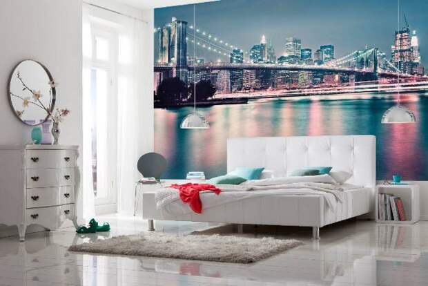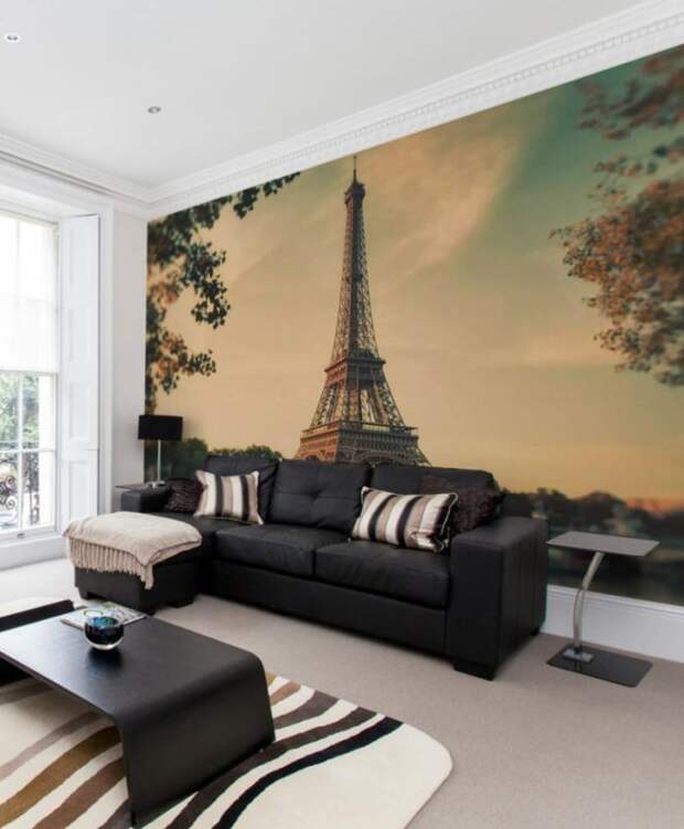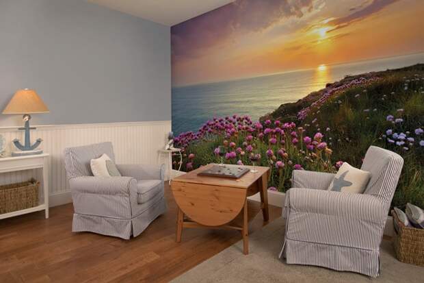 Фотообои клеятся на целую стену, отдельную зону или выделяются в панно. Внедрите в интерьер не один, а два участка с полотнами, но только если они поддерживают и продолжают друг друга на уровне идеи. Чтобы поклеить их, используют обойный клей. Стоят они недорого. Человек, который делает ремонт эконом-класса, может воспользоваться такой разновидностью обоев.