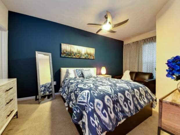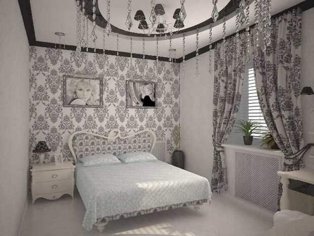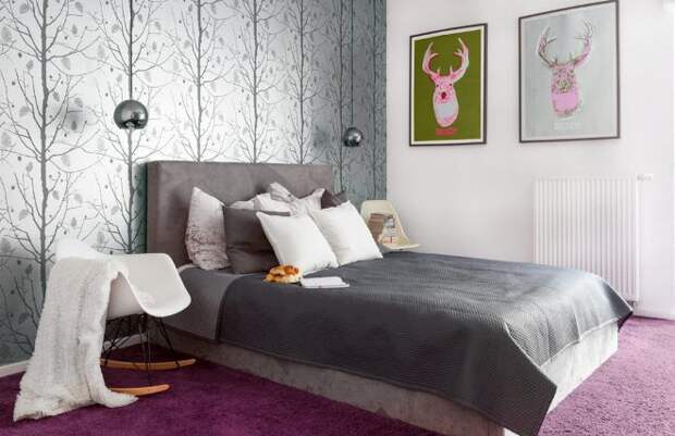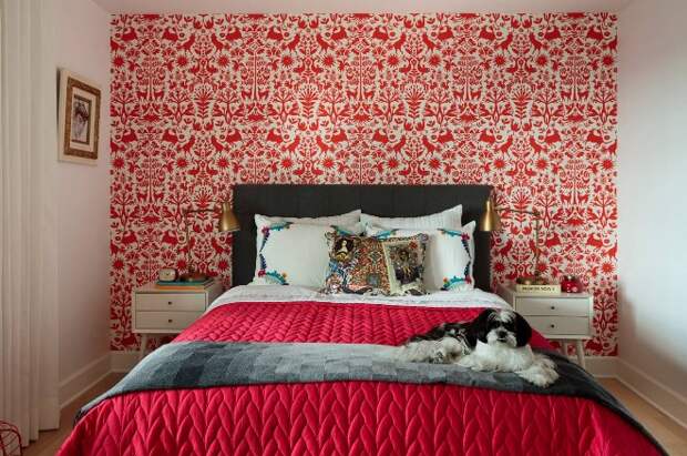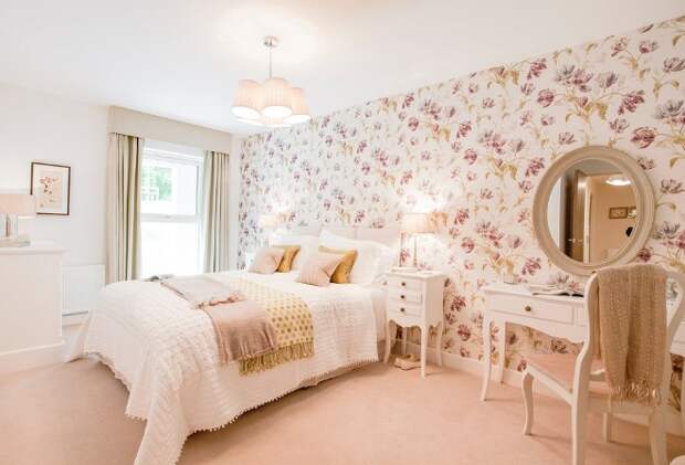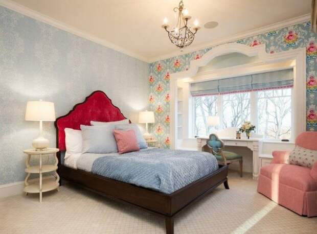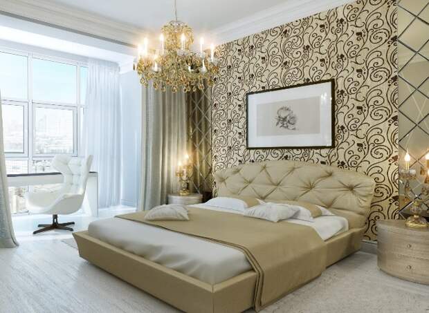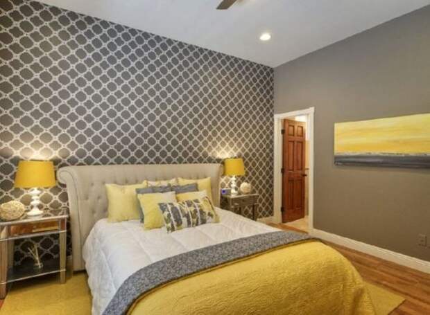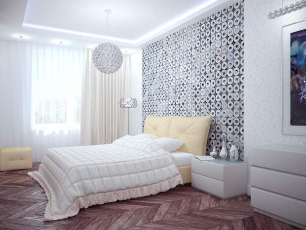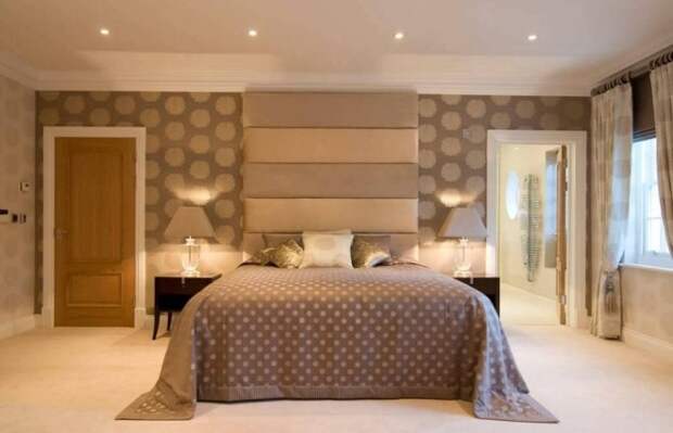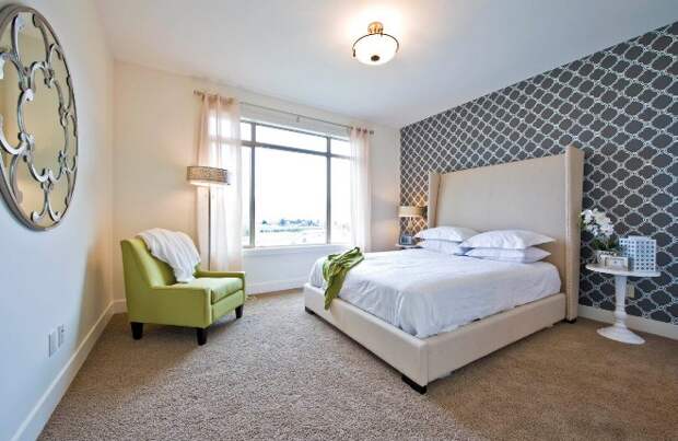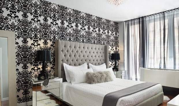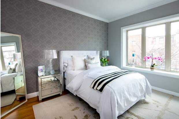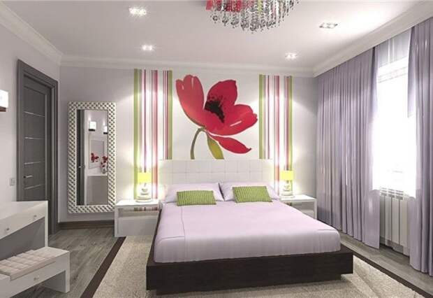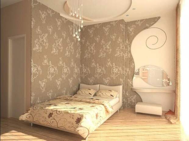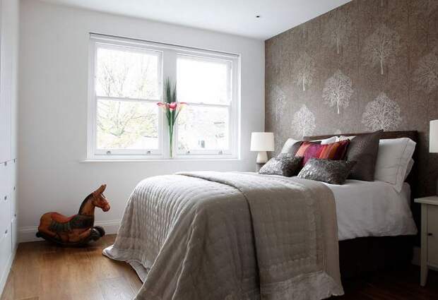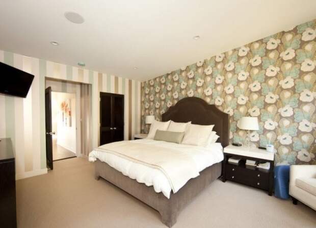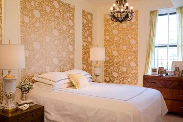 Еще один декоративный прием, который используется в спальне, – создание красивого изголовья кровати с помощью обоев. Стену или полосу, равную ширине кровати с захватом одного метра, оформляют акцентными обоями: яркими или с крупным рисунком. Даже с обычной спальной мебелью такой интерьер смотрится выгодно.
