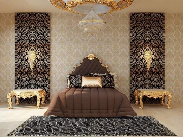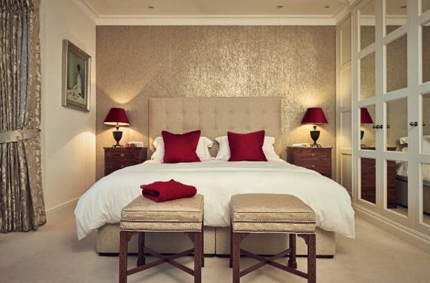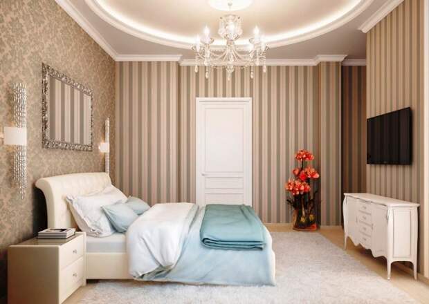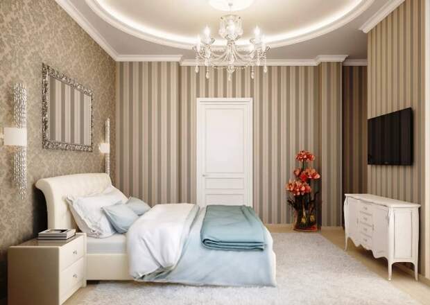 При выборе обоев в спальню учитывается то, что они должны сочетаться по цветовой гамме, орнаменту и даже качеству. Как минимум странным выглядит выбор тяжелых объемных листов на пару с дешевыми бумажными. Это возможно в том случае, когда переходы между фактурами оформляют как визуальную и концептуальную границу. Например, комнату оклеивают обычными однотонными обоями из бумаги или флизелина, подходящие по контрасту текстильные располагают в виде панно, а по бокам составляют гипсовые колонны. С точки зрения геометрии, идеи покрытия обоями делят на следующие типы: