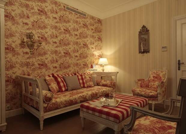При горизонтальной оклейке лучше проводить сочетание обоев двух цветов в спальне, выбирая их из одного или соседних сочетаний цветового круга. Нижняя часть стены может быть в полоску, обычно она занимает от 1/3 до 1/2 высоты. Классическое сочетание, которое часто встречается в английском интерьере, – спокойный полосатый низ и верх в той же цветовой гамме, но с орнаментом или рисунком в цветочек.