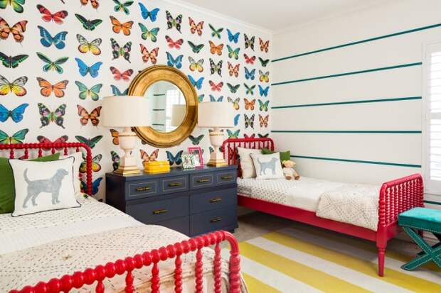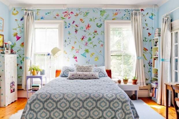 Приемлемый вариант – комбинировать обои в детской или спальне так: основа легкого цвета с однотонным неброским рисунком или без него, акцент – обои с ярким принтом. Можно воспользоваться приемами: три стены плюс одна, фон и панно, горизонтальная поклейка. Оригинально смотрится оформление панно вагонкой.
