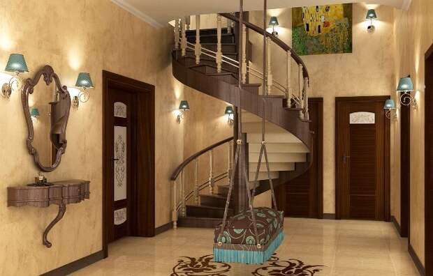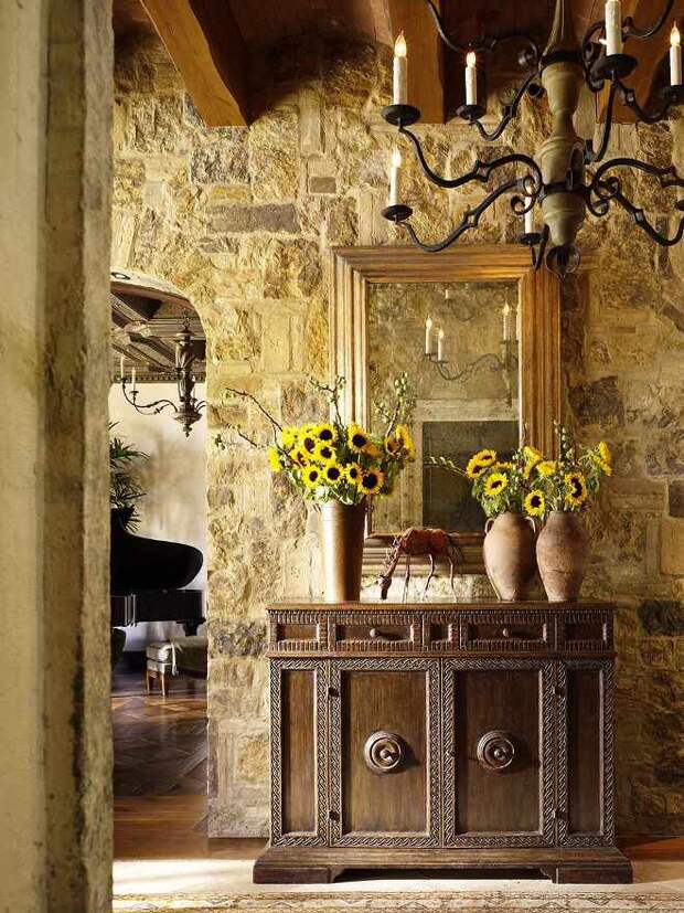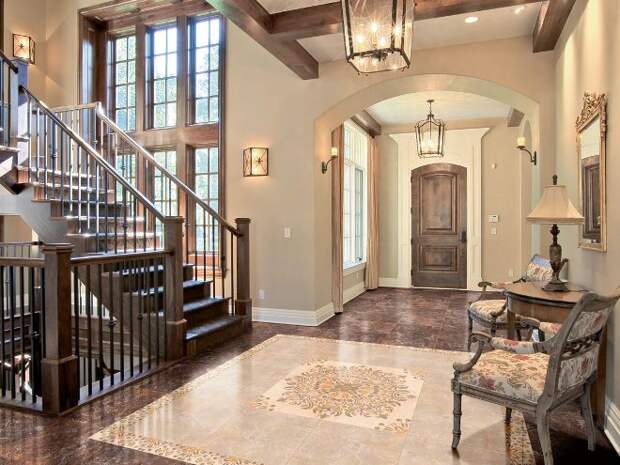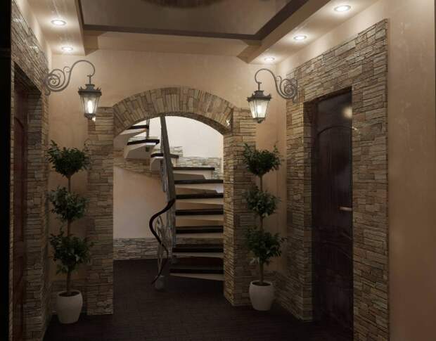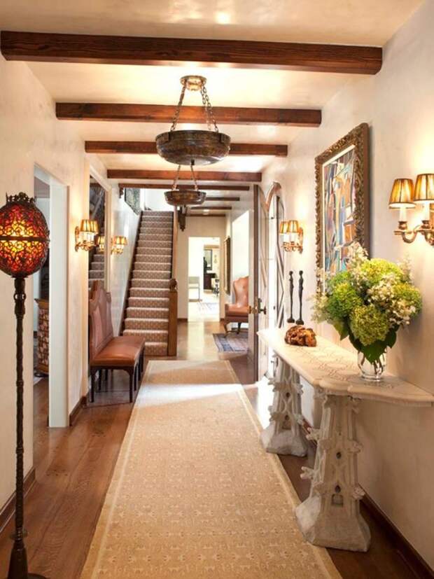 Желательно применять текстиль, расставлять и развешивать по прихожей безделушки. Или же снабдить затейливым абажуром лампу, добавить на деревянные элементы резьбу, а на каменные — рисунок.
